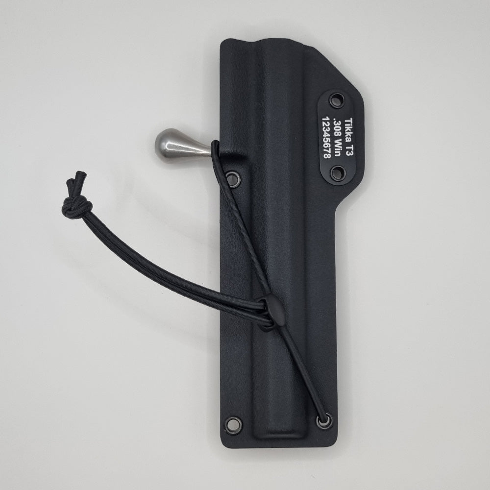 Made from rigid Kydex, our Tikka T3 Bolt Protector is designed to protect critical bolt surfaces during storage and transport. An elastic retention strap holds the bolt securely in place